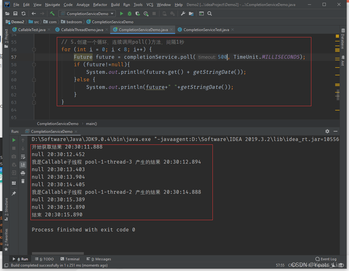 public class CompletionServiceDemo { public static void main(String[] args) throws ExecutionException, InterruptedException { // 1.创建线程池 ExecutorService executorService = Executors.newFixedThreadPool(5); // 2.创建一个ExecutorCompletionService放入线程池实现CompletionService接口 CompletionService completionService = new ExecutorCompletionService(executorService); // 3.创建Callable子线程对象任务 Callable callable_1 = new Callable() { @Override public String call() throws Exception { Thread.sleep(5000); return ("我是Callable子线程 " +Thread.currentThread().getName()+ " 产生的结果 " ); } }; Callable callable_2 = new Callable() { @Override public String call() throws Exception { Thread.sleep(3000); return ("我是Callable子线程 " +Thread.currentThread().getName()+ " 产生的结果 " ); } }; Callable callable_3 = new Callable() { @Override public String call() throws Exception { Thread.sleep(1000); return ("我是Callable子线程 " +Thread.currentThread().getName()+ " 产生的结果 " ); } }; // 3.使用CompletionService提交三个任务到线程池 completionService.submit(callable_1); completionService.submit(callable_2); completionService.submit(callable_3); // 4.获取返回值 System.out.println("开始获取结果 " + getStringDate()); // 5.创建一个循环,连续调用poll()方法,间隔1秒 for (int i = 0; i < 8; i++) { Future future = completionService.poll(500, TimeUnit.MILLISECONDS); if (future!=null){ System.out.println(future.get() + getStringDate()); }else { System.out.println(future+" "+getStringDate()); } } System.out.println("结束 " + getStringDate()); // 6.关闭线程池 executorService.shutdown(); } // 获取时间函数 public static String getStringDate() { Date currentTime = new Date(); SimpleDateFormat simpleDateFormat = new SimpleDateFormat("HH:mm:ss.SSS"); String date = simpleDateFormat.format(currentTime); return date; } }