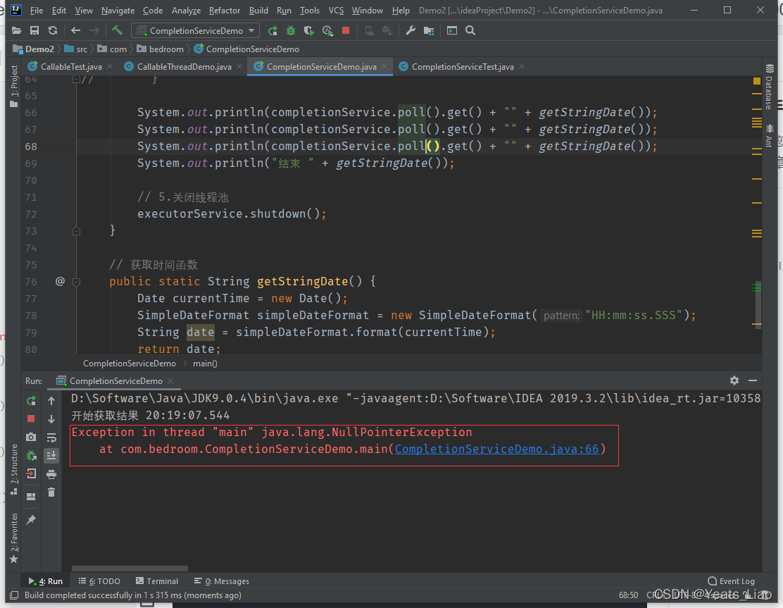 public class CompletionServiceDemo { public static void main(String[] args) throws ExecutionException, InterruptedException { // 1.创建线程池 ExecutorService executorService = Executors.newFixedThreadPool(5); // 2.创建Callable子线程对象任务 Callable callable_1 = new Callable() { @Override public String call() throws Exception { Thread.sleep(5000); return ("我是Callable子线程 " +Thread.currentThread().getName()+ " 产生的结果 " ); } }; Callable callable_2 = new Callable() { @Override public String call() throws Exception { Thread.sleep(3000); return ("我是Callable子线程 " +Thread.currentThread().getName()+ " 产生的结果 " ); } }; Callable callable_3 = new Callable() { @Override public String call() throws Exception { Thread.sleep(1000); return ("我是Callable子线程 " +Thread.currentThread().getName()+ " 产生的结果 " ); } }; // 3.使用Future提交三个任务到线程池 Future future_1 = executorService.submit(callable_1); Future future_2 = executorService.submit(callable_2); Future future_3 = executorService.submit(callable_3); // 4.获取返回值 System.out.println("开始获取结果 " + getStringDate()); System.out.println(future_1.get() + "" + getStringDate()); System.out.println(future_2.get() + "" + getStringDate()); System.out.println(future_3.get() + "" + getStringDate()); System.out.println("结束 " + getStringDate()); // 5.关闭线程池 executorService.shutdown(); } // 获取时间函数 public static String getStringDate() { Date currentTime = new Date(); SimpleDateFormat simpleDateFormat = new SimpleDateFormat("HH:mm:ss.SSS"); String date = simpleDateFormat.format(currentTime); return date; } }