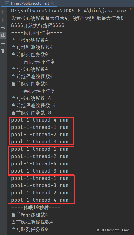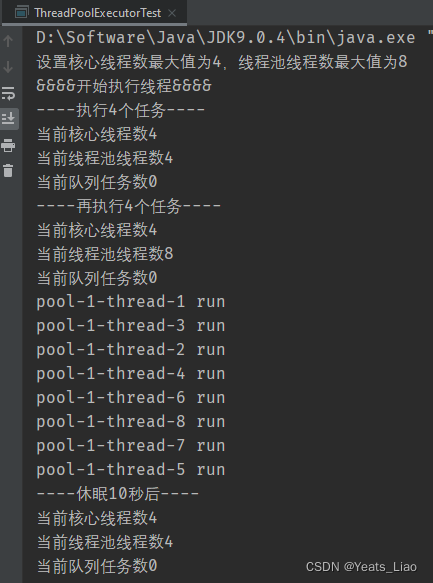 public class ThreadPoolExecutorTest { public static void main(String[] args) throws InterruptedException { // 1.创建自定义线程池 ThreadPoolExecutor threadPoolExecutor = new ThreadPoolExecutor(4, 8, 5, TimeUnit.SECONDS, new SynchronousQueue<>(), Executors.defaultThreadFactory(), new ThreadPoolExecutor.AbortPolicy()); // 2.创建线程任务 Runnable runnable = new Runnable() { @Override public void run() { try { Thread.sleep(2000); System.out.println(Thread.currentThread().getName() + " run"); } catch (InterruptedException e) { e.printStackTrace(); } } }; // 3.执行任务 System.out.println("设置核心线程数最大值为4,线程池线程数最大值为8"); System.out.println("&&&&开始执行线程&&&&"); System.out.println("----执行4个任务----"); threadPoolExecutor.execute(runnable); threadPoolExecutor.execute(runnable); threadPoolExecutor.execute(runnable); threadPoolExecutor.execute(runnable); System.out.println("当前核心线程数" + threadPoolExecutor.getCorePoolSize()); System.out.println("当前线程池线程数" + threadPoolExecutor.getPoolSize()); System.out.println("当前队列任务数" + threadPoolExecutor.getQueue().size()); System.out.println("----再执行4个任务----"); threadPoolExecutor.execute(runnable); threadPoolExecutor.execute(runnable); threadPoolExecutor.execute(runnable); threadPoolExecutor.execute(runnable); System.out.println("当前核心线程数" + threadPoolExecutor.getCorePoolSize()); System.out.println("当前线程池线程数" + threadPoolExecutor.getPoolSize()); System.out.println("当前队列任务数" + threadPoolExecutor.getQueue().size()); Thread.sleep(10000); System.out.println("----休眠10秒后----"); System.out.println("当前核心线程数" + threadPoolExecutor.getCorePoolSize()); System.out.println("当前线程池线程数" + threadPoolExecutor.getPoolSize()); System.out.println("当前队列任务数" + threadPoolExecutor.getQueue().size()); // 4.关闭线程池 threadPoolExecutor.shutdown(); } }