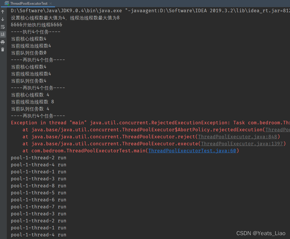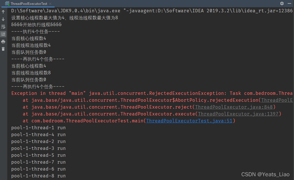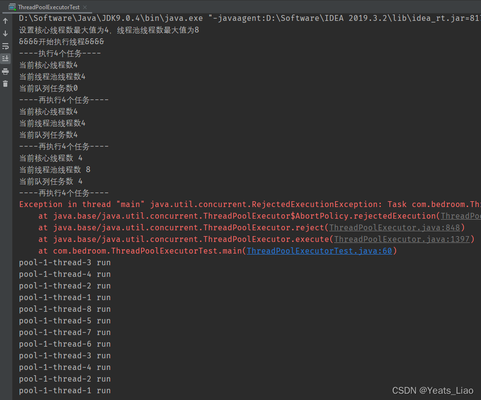 创建 ThreadPoolExecutorTest类,默认使用ThreadPoolExecutor.AbortPolicy拒绝策略,队列是SynchronousQueue,超出核心线程的任务会创建新的线程来执行,设置核心线程数最大值为4,线程池线程数最大值为8,最大等待时间为5秒