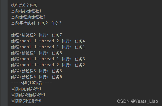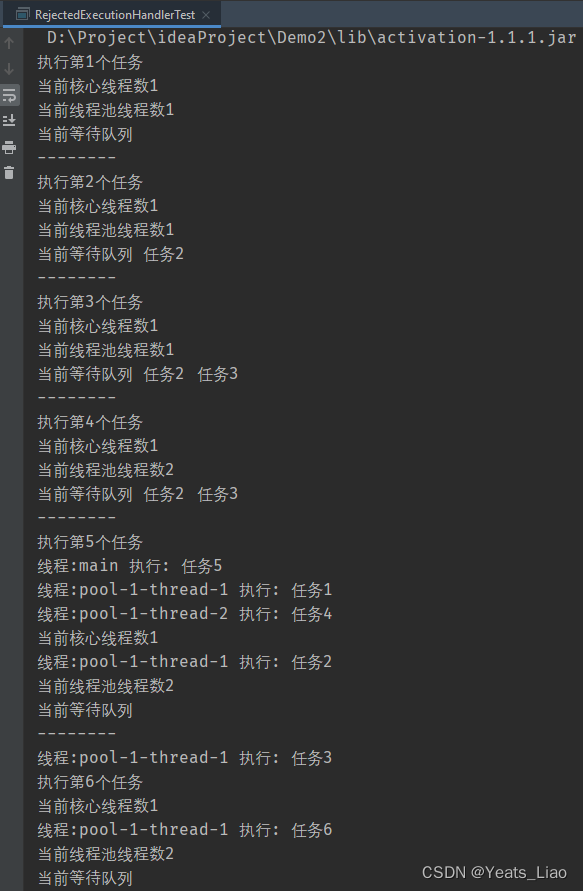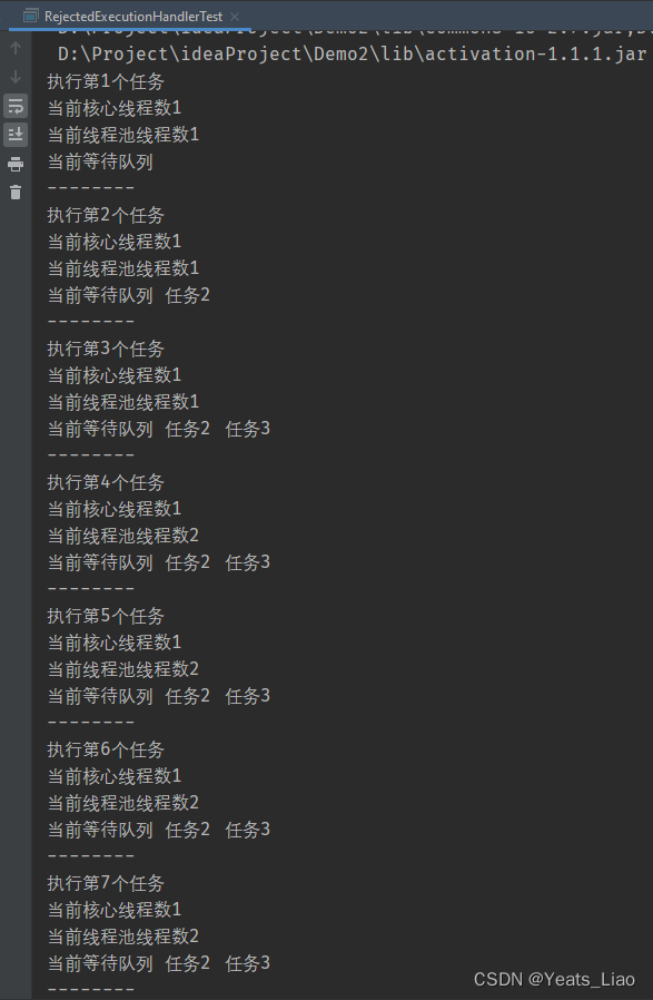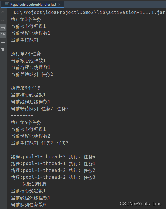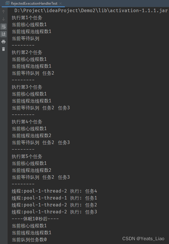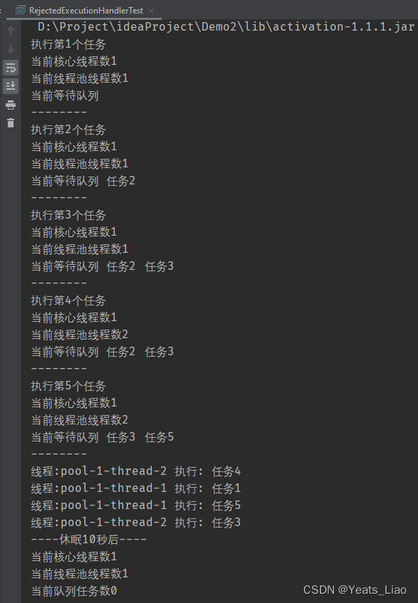 public class RejectedExecutionHandlerTest { public static void main(String[] args) throws InterruptedException { // 1.创建自定义线程池 ThreadPoolExecutor threadPoolExecutor = new ThreadPoolExecutor(2, 4, 5, TimeUnit.SECONDS, new ArrayBlockingQueue<>(2), Executors.defaultThreadFactory(), new ThreadPoolExecutor.AbortPolicy()); // 2.创建线程任务 for (int i = 1; i <= 6; i++) { // 3.执行任务 System.out.println("执行第"+i+"个任务"); threadPoolExecutor.execute(new runnable("任务"+i)); System.out.println("当前核心线程数" + threadPoolExecutor.getCorePoolSize()); System.out.println("当前线程池线程数" + threadPoolExecutor.getPoolSize()); // 4.迭代器获取等待队列 Iterator iterator = threadPoolExecutor.getQueue().iterator(); System.out.print("当前等待队列 "); while (iterator.hasNext()){ runnable thread = (runnable) iterator.next(); System.out.print(thread.name + "\t"); } System.out.print("\n"); System.out.println("--------"); } Thread.sleep(10000); System.out.println("----休眠10秒后----"); System.out.println("当前核心线程数" + threadPoolExecutor.getCorePoolSize()); System.out.println("当前线程池线程数" + threadPoolExecutor.getPoolSize()); System.out.println("当前队列任务数" + threadPoolExecutor.getQueue().size()); // 5.关闭线程池 threadPoolExecutor.shutdown(); } // 实现Runnable static class runnable implements Runnable{ // 设置任务名 String name; public runnable(String setName) { this.name = setName; } @Override public void run() { try { System.out.println("线程:"+Thread.currentThread().getName() +" 执行: "+name); } catch (Exception e) { e.printStackTrace(); } } } }