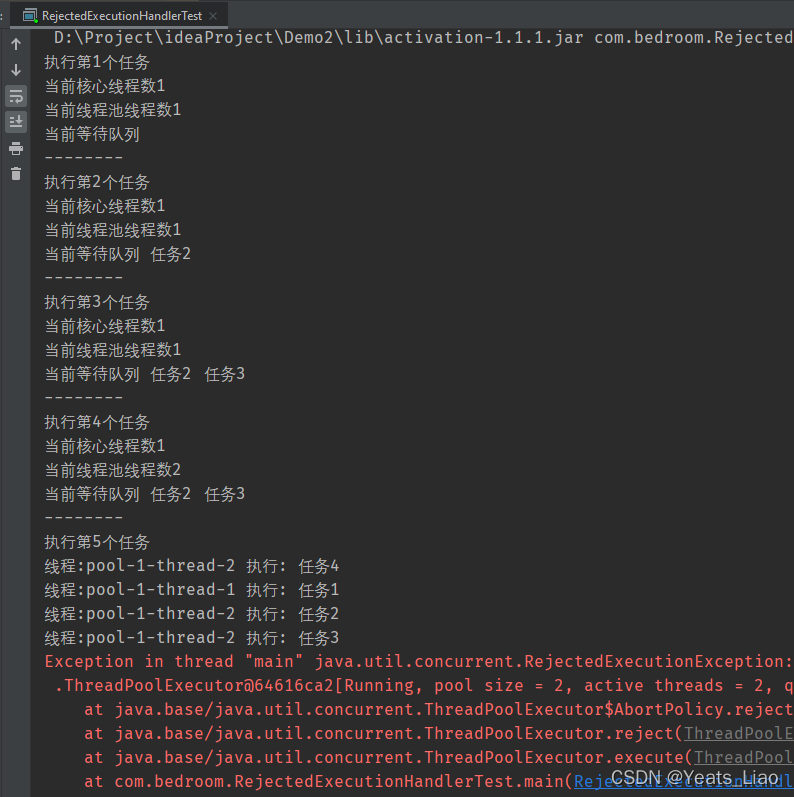 但如果再执行1个任务,线程数超过maximumPoolSize+workQueue,再提交任务将被丢弃并抛出RejectedExecutionException异常