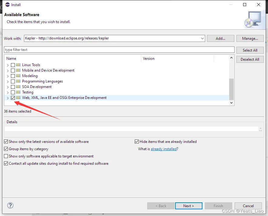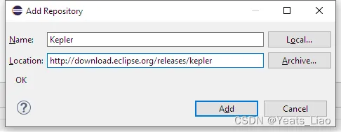 Work with-Add,Name填写Kepler,Location填写http://download.eclipse.org/releases/kepler