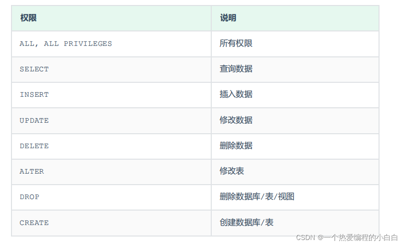MySQL中定义了很多种权限,但是常用的就以下几种: