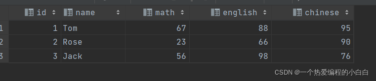 create table score( id int comment 'ID', name varchar(20) comment '姓名', math int comment '数学', english int comment '英语', chinese int comment '语文' ) comment '学员成绩表'; insert into score(id, name, math, english, chinese) VALUES (1, 'Tom', 67, 88, 95 ), (2, 'Rose' , 23, 66, 90),(3, 'Jack', 56, 98, 76);