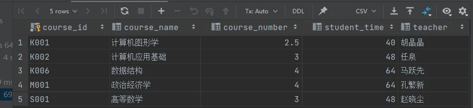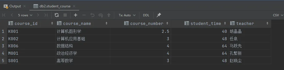 INSERT INTO student_course values ('K001', '计算机图形学', 2.5, 40, '胡晶晶'), ('K002', '计算机应用基础', 3, 48, '任泉'), ('K006', '数据结构', 4, 64, '马跃先'), ('M001', '政治经济学', 4, 64, '孔繁新'), ('S001', '高等数学', 3, 48, '赵晓尘');
