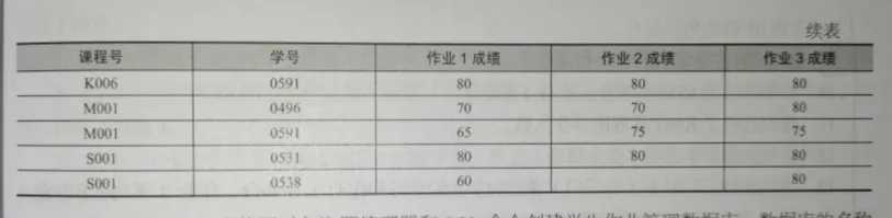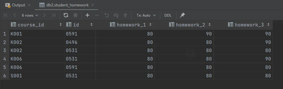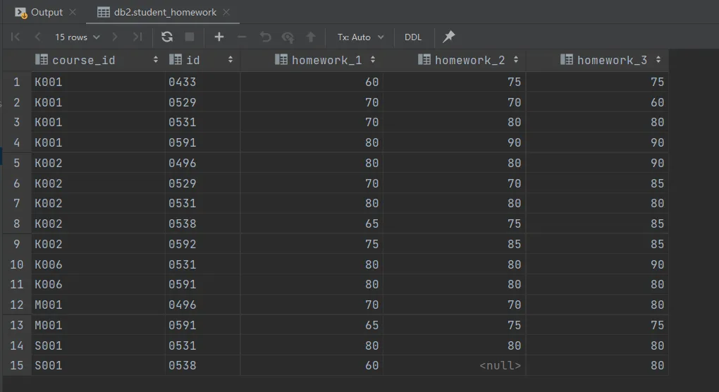insert into student_homework values ('K001','0433',60,75,75), ('K001','0529',70,70,60), ('K001','0531',70,80,80), ('K001','0591',80,90,90), ('K002','0496',80,80,90), ('K002','0529',70,70,85), ('K002','0531',80,80,80), ('K002','0538',65,75,85), ('K002','0592',75,85,85), ('K006','0531',80,80,90), ('K006','0591',80,80,80), ('M001','0496',70,70,80), ('M001','0591',65,75,75), ('S001','0531',80,80,80), ('S001','0538',60,null,80);