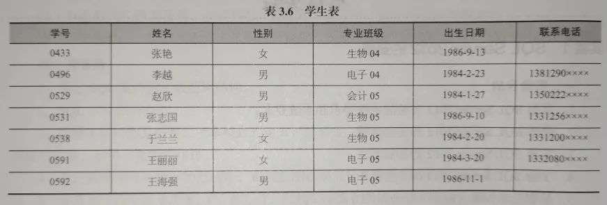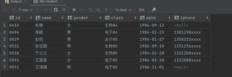 insert into student values ('0433', '张艳', '女', '生物04', '1986-9-13', null), ('0496', '李越', '男', '电子04', '1984-2-23', '1381290xxxx'), ('0529', '赵欣', '男', '会计05', '1984-1-27', '1350222xxxx'), ('0531', '张志国', '男', '生物05', '1986-9-10', '1331256xxxx'), ('0538', '于兰兰', '女', '生物05', '1984-2-20', '1331200xxxx'), ('0591', '王丽丽', '女', '电子05', '1984-3-20', '1332080xxxx'), ('0592', '王海强', '男', '电子05', '1986-11-1', null);