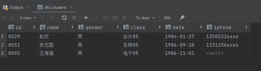 drop table if exists student; create table student ( id varchar(10) comment '学号', name varchar(10) NOT NULL comment '姓名', gender char(1) comment '性别', class varchar(20) comment '专业班级', date date comment '出生日期', iphone varchar(11) comment '联系电话' ) comment '学生表'; select * from student;