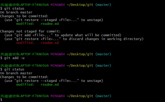 5、我修改了好几个文件是之前git add到暂存区过的,要怎么直接添加这几个文件呢,我们可以通过git add -u将之前git追踪过的文件一次性添加到暂存区。