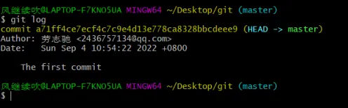 2、通过git init 初始化一个git仓库,通过git status命令发现有两个未被git追踪 的文件,使用git add命令将这两个文件添加到暂存区之后,再次使用git status命令,发现有两个文件可以被commit,就是我们刚刚添加的两个文件,git 提示我们可以使用git rm --cached <file>...来删除暂存区内不想要的文件,接下来通过git commit进行第一次commit,再次使用git status命令查看显示工作目录和暂存区的状态。