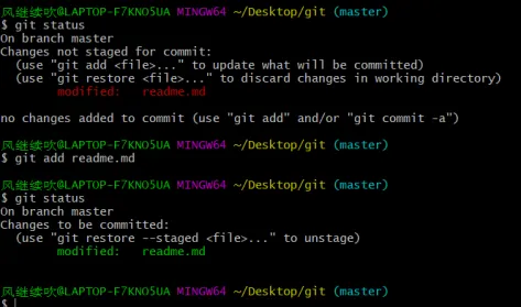 3.我在readme.md中添加了一行字,此时使用git status查看状态,发现提示readme.md被修改了,如果我们要同步这个修改的话,还要再次通过git add readme.md将readme.md添加进暂存区,再通过git commit进行提交。