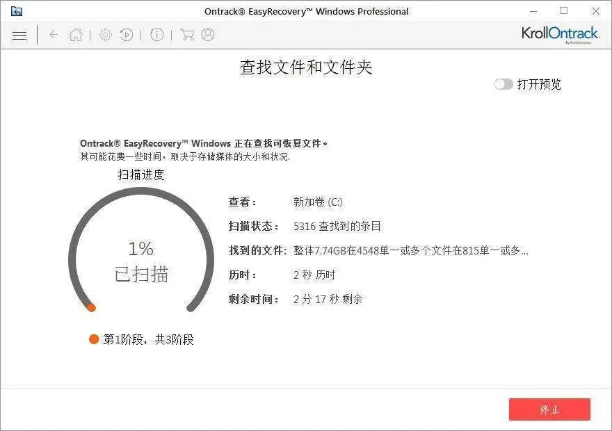 查找文件和文件夹。单击“扫描”按钮后,就可以开始扫描文件所在磁盘,这里共分为3个阶段,全部完成后,就可以显示丢失的文件了。