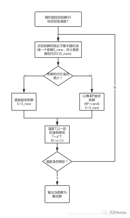 模拟退火算法的思想借鉴于固体的退火过程,当固体的温度很高时,内能比较大,固体内的粒子处于快速无序运动状态,当温度慢慢降低,固体的内能减小,粒子逐渐趋于有序,最终固体处于常温状态,内能达到最小,此时粒子最为稳定。
