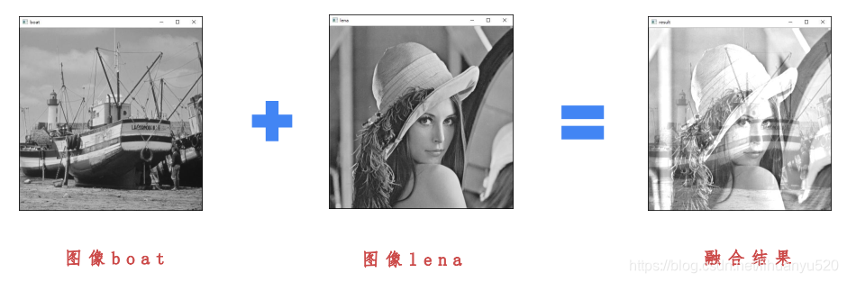 #%%图像融合 import cv2 lena = cv2.imread(r"C:\Users\lihuanyu\Desktop\opencv\image\add\lena.bmp") boat = cv2.imread(r"C:\Users\lihuanyu\Desktop\opencv\image\add\boat.bmp") result=cv2.addWeighted(lena,1,boat,1,0) cv2.imshow("lena",lena) cv2.imshow("boat",boat) cv2.imshow("result",result) cv2.waitKey(0) cv2.destroyAllWindows()