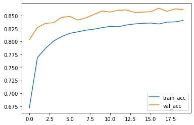 model.compile(optimizer="adam", loss='categorical_crossentropy', metrics=["acc"]) #加入验证集 history = model.fit(train_image,train_label_onehot,epochs=20,validation_data=(test_image,test_label_onehot)) plt.plot(history.epoch,history.history.get("acc"),label="train_acc") plt.plot(history.epoch,history.history.get("val_acc"),label="val_acc") plt.legend() plt.show()