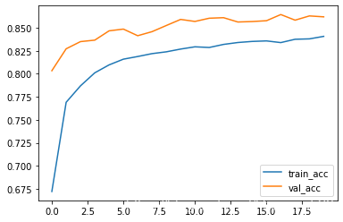 model = tf.keras.Sequential() model.add(tf.keras.layers.Flatten(input_shape=(28,28))) # 28*28 model.add(tf.keras.layers.Dense(128, activation='relu')) model.add(tf.keras.layers.Dropout(0.5)) model.add(tf.keras.layers.Dense(128, activation='relu')) model.add(tf.keras.layers.Dropout(0.5)) model.add(tf.keras.layers.Dense(128, activation='relu')) model.add(tf.keras.layers.Dropout(0.5)) model.add(tf.keras.layers.Dense(10, activation='softmax')) model.compile(optimizer="adam", loss='categorical_crossentropy', metrics=["acc"]) #加入验证集 history = model.fit(train_image,train_label_onehot,epochs=20,validation_data=(test_image,test_label_onehot)) plt.plot(history.epoch,history.history.get("acc"),label="train_acc") plt.plot(history.epoch,history.history.get("val_acc"),label="val_acc") plt.legend() plt.show()