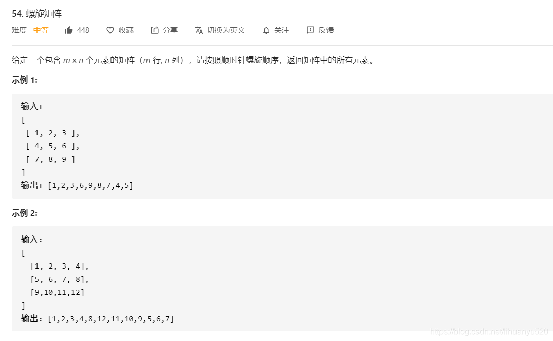 class Solution(object): def spiralOrder(self, matrix): """ :type matrix: List[List[int]] :rtype: List[int] """ import math if matrix == []: return matrix list1 = [] wide = len(matrix[0]) high = len(matrix) rounds = (min(wide,high)+1)//2 for i in range(rounds): #轮次逐层计算 for j in range(4): #表示4个边,我们顺时针计算 if j == 0: #表示上边 list1 = list1 + [matrix[i][z] for z in range(i,wide - i)] elif j == 1: #表示右边 list1 = list1 + [matrix[z][wide- i -1] for z in range(i + 1,high - i)] elif j == 2 and high - i -1 != i: #下方 list1 = list1 + [matrix[high - i -1][z] for z in range(wide - i - 2,i-1,-1)] elif j == 3 and wide - i - 1 != i: #左边 list1 = list1 + [matrix[z][i] for z in range(high - i - 2,i,-1)] return list1