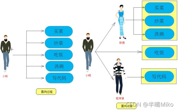 举个例子,小明完成买菜,做菜,吃饭,洗完,写代码功能。大家一起来看看有对象和没对象的区别: