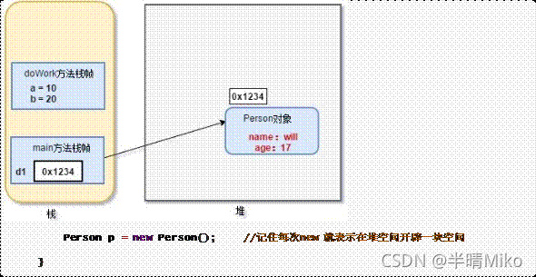 class Person { String name; int age; } public class App { public static void main(String[] args) { App.doWork();//调用doWork方法 Person p = new Person(); //每次new就表示在堆空间开辟一块空间 } private static void doWork() { int a = 10; int b = 20; } }