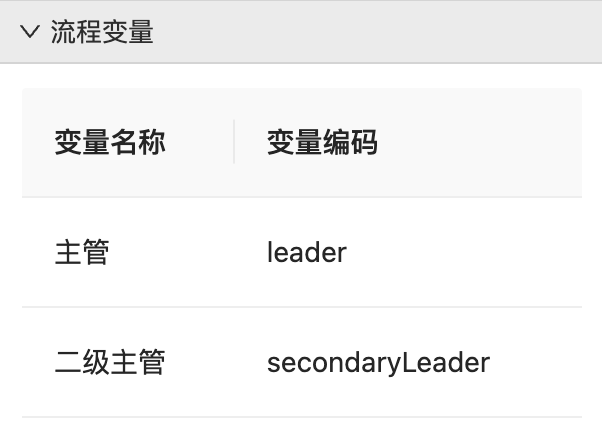2. 新增办理人变量:点击画布空白页,进入“流程配置”,新增如下“流程变量”,作为“主管审批”、“二级主管审批”的办理人变量。