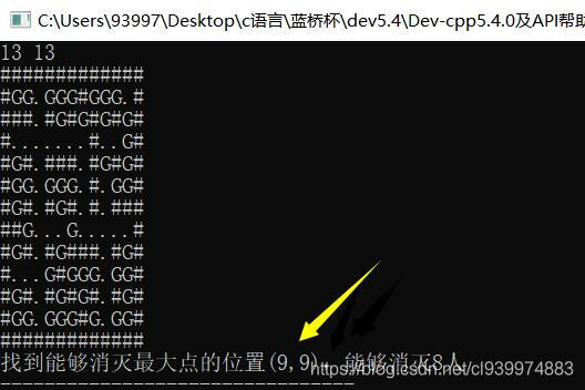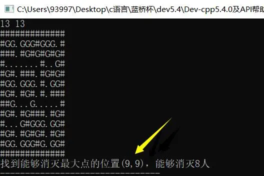 #include <stdio.h> int main() { char a[20][21]; //定义地图的长度不会超过20*20的 int n,m,i,j,sum,max=0,p,q,x,y; scanf("%d%d",&n,&m); //n - 行数 m-列数 //开始读入n行字符地图 for(i=0;i<n;i++) scanf("%s",a[i]); //进行遍历地图 for(i=0;i<n;i++) for(j=0;j<m;j++) { //1.1 首先判断这个点是不是平地 if(a[i][j] == '.') { //1.2 是的话... //2.1 进行不停上下左右遍历 sum=0; //2.2 设置x,y作为i,j不停往一个位置的遍历 x=i,y=j; while(a[x][y]!='#') { if(a[x][y] == 'G') sum++; x--; } //向下不断进行遍历 x=i,y=j; while(a[x][y]!='#') { if(a[x][y] == 'G') sum++; x++; } //向左不断遍历 x=i,y=j; while(a[x][y]!='#') { if(a[x][y] == 'G') sum++; y--; } //向右不断遍历 x=i,y=j; while(a[x][y]!='#') { if(a[x][y] == 'G') sum++; y++; } //1.3 是的话进行查找每个点能够击杀的最多人次sum,并且保存i,j的坐标 用p和q来保存 if(sum>max){ max = sum; p = i,q = j; } }//if }//for printf("找到能够消灭最大点的位置(%d,%d),能够消灭%d人",p,q,max); return 0; }
