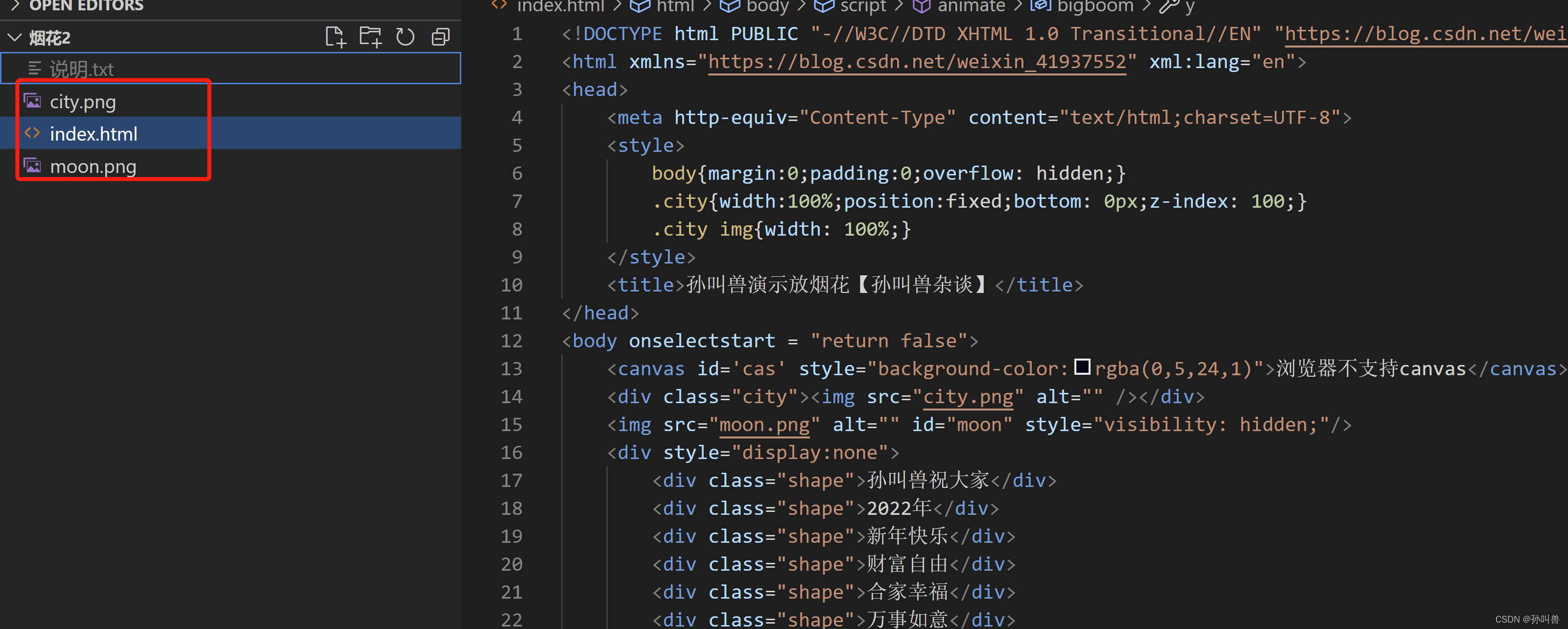 <canvas id='cas' style="background-color:rgba(0,5,24,1)">浏览器不支持canvas</canvas> <div class="city"><img src="city.png" alt="" /></div> <img src="moon.png" alt="" id="moon" style="visibility: hidden;"/> <div style="display:none"> <div class="shape">孙叫兽祝大家</div> <div class="shape">2022年</div> <div class="shape">新年快乐</div> <div class="shape">财富自由</div> <div class="shape">合家幸福</div> <div class="shape">万事如意</div> <div class="shape">心想事成</div> <div class="shape">财源广进</div> </div>