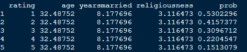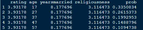 testdata<-data.frame(rating=c(1,2,3,4,5),age=mean(Affairs$age),yearsmarried=mean(Affairs$yearsmarried),religiousness=mean(Affairs$religiousness)) >head(testdata)