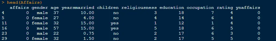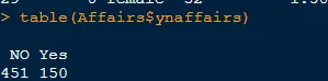 data(Affairs,package="AER") summary(Affairs) table(Affairs$affairs) >prop.table(table(Affairs$affairs))