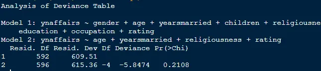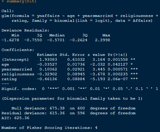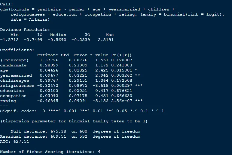 fit<-glm(ynaffairs~gender+age+yearsmarried+children+religiousness+education+occupation+rating,data=Affairs,family=binomial(link=logit)) summary(fit)