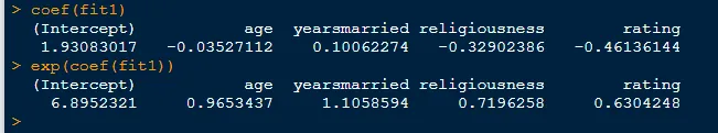 >fit1<-glm(ynaffairs~age+yearsmarried+religiousness+rating,data=Affairs,family=binomial(link=logit))