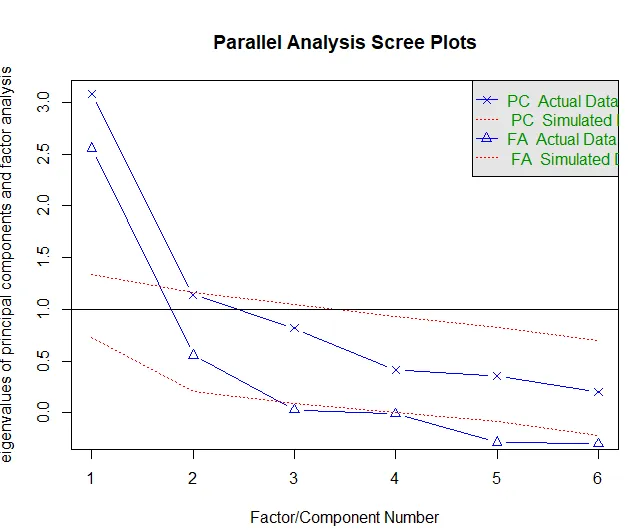 同样使用fa.parallel()函数判断参与分析的因子个数,这里我们把选项参数fa设置为‘Both’表示即研究主成分也研究因子分析: