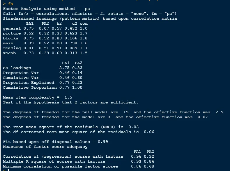 fa<-fa(correlations,nfactors=2,rotate="none",fm="pa")