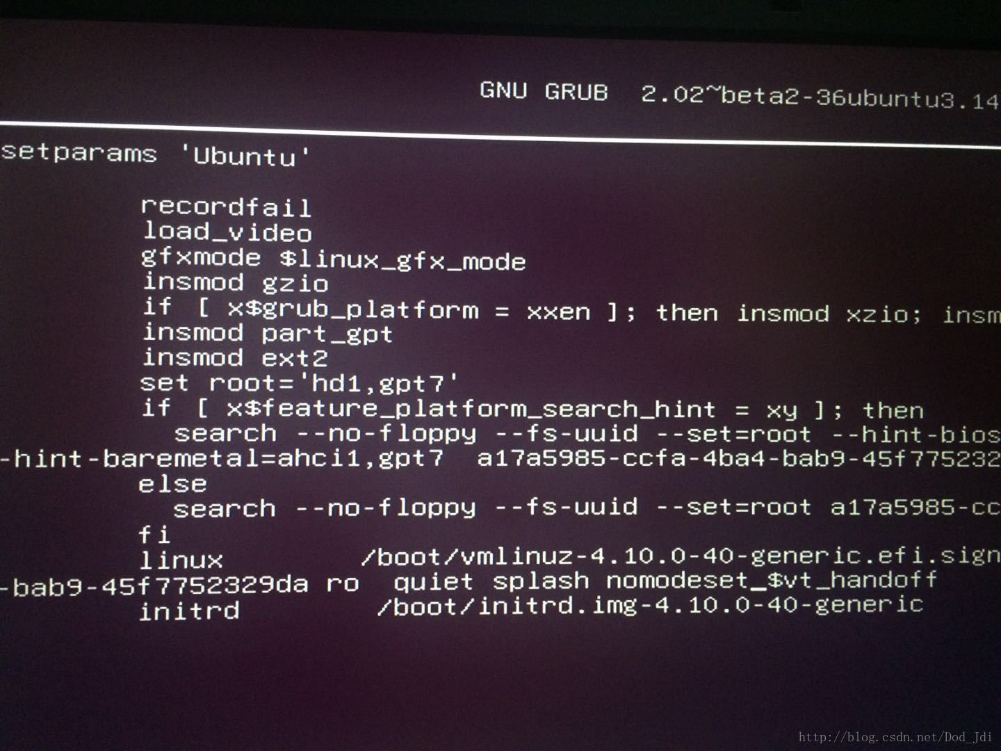 将 quite splash $vt_handoff 改为 quite splash nomodeset_$vt_handoff