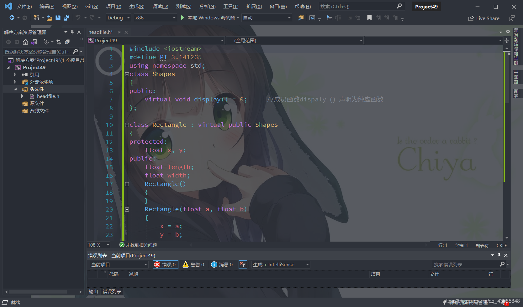 2、这里我们通过题目要求,我们是要定义类,并派生类等等,这时我们点击左侧的解决方案管理器创建一个头文件名为"headfile",即右键头文件,选择添加新建项,并选择头文件(.h),设置好名称后我们点击添加,即完成用户头文件定义的创建: