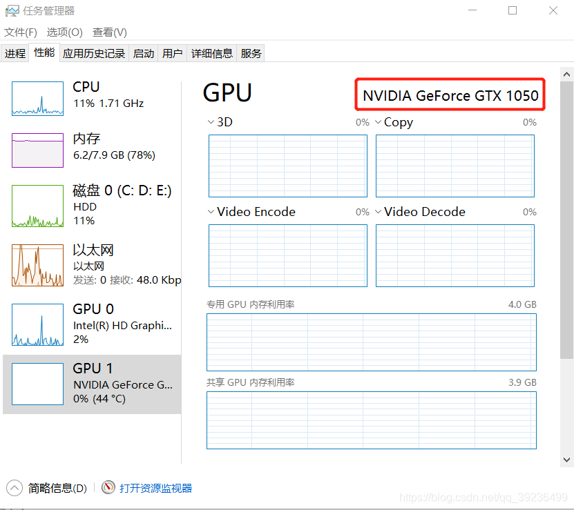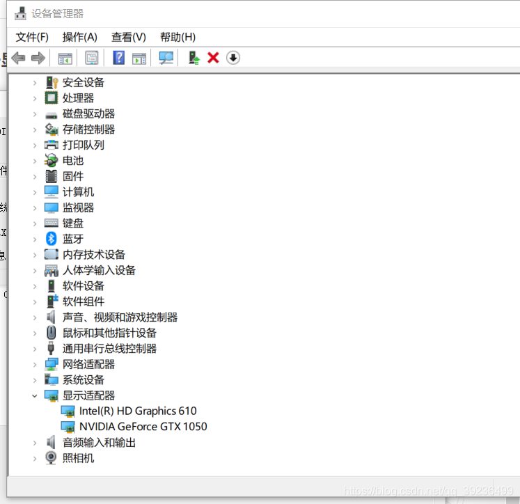 方法一:打开设备管理器->显示配适器,查询到为NVIDIA GeForce GTX 1050