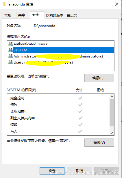 解决方法步骤:找到anaconda文件夹右击打开属性->安全->修改为system