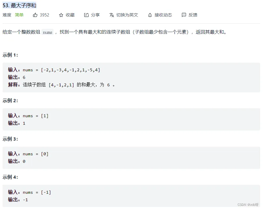 class Solution { public: int maxSubArray(vector<int>& nums) { //先替换元素 更新数组 for (int i = 1; i < nums.size(); i++) { if (nums[i - 1] > 0) { //如果前一个元素>0 后一个元素改为两者之和 nums[i] = nums[i - 1] + nums[i]; //新生成的记录当前的子序和最大值的数组 } } //再遍历查找最大值 int res = nums[0]; for (int i : nums) { res = max(res, i); } return res; } };