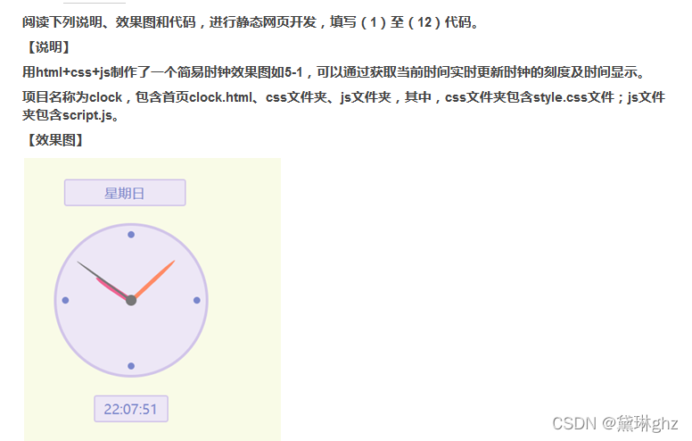 //(1)声明一个7个长度的数组daysvardays=[]; days[0]='星期日'; days[1]='星期一'; days[2]='星期二'; days[3]='星期三'; days[4]='星期四'; days[5]='星期五'; //(2)往数组days后面添加一个元素,值为星期六;days[6]='星期六'; vardateDisplay=document.getElementById('date'); varhourHand=document.getElementById('hour-hand'); varminuteHand=document.getElementById('minute-hand'); varsecondHand=document.getElementById('second-hand'); vardigitalTime=document.getElementById('digital-time'); varclock=function() { //(3)获取当前时间vartimeNow=newDate(); varday=timeNow.getDay(); vardate=timeNow.getDate(); varmonth=timeNow.getMonth(); dateDisplay.innerHTML=days[day]; //(4)获取当前时间的秒varseconds=timeNow.getSeconds() ; varsRot=seconds*6-90; //(5)获取当前时间的分钟varminutes=timeNow.getMinutes(); varmRot= (minutes*6) + (seconds/10) -90; //(6)获取当前时间的小时varhours=timeNow.getHours(); varhRot= (hours%12*30) + (minutes/2) -90; hourHand.style.transform="rotate("+hRot+"deg)"; minuteHand.style.transform="rotate("+mRot+"deg)"; secondHand.style.transform="rotate("+sRot+"deg)"; //(7)给digitalTime的内容赋值digitalTime.innerHTML=format(hours)+":"+format(minutes)+":"+format(seconds); } functionformat(num) { //(8)三元运算符,如果小于10则在num前面加个0,否则返回numreturnnum=num<10?'0'+num:num; } (functionrun() { //(9)调用clock方法clock(); //(10)(11)(12)定义定时器1秒后执行调用自己setTimeout(function(){ run();}, 1000); })();