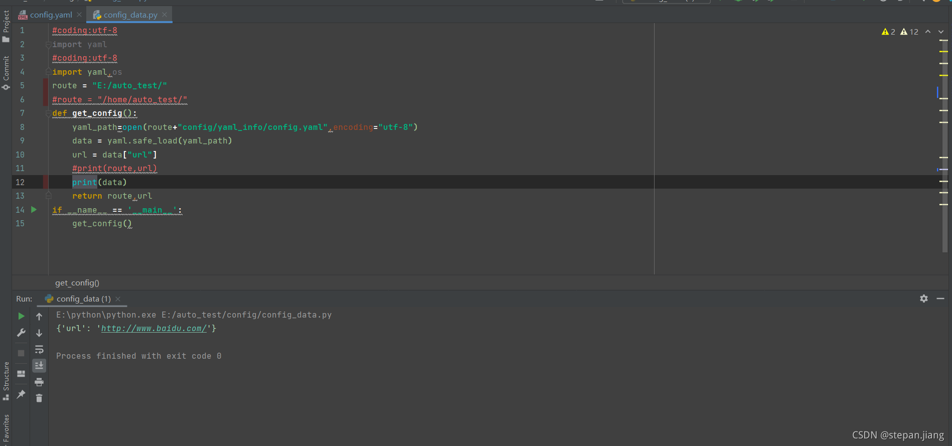 #coding:utf-8importyaml#coding:utf-8importyaml,osroute="E:/auto_test/"#route = "/home/auto_test/"defget_config(): yaml_path=open(route+"config/yaml_info/config.yaml",encoding="utf-8") data=yaml.safe_load(yaml_path) url=data["url"] #print(route,url)#print(data)returnroute,urlif__name__=='__main__': get_config()