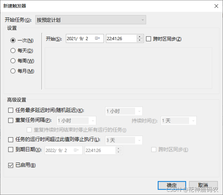 - 建立触发器,对应触发方式,可一次,也可每天每周这种: