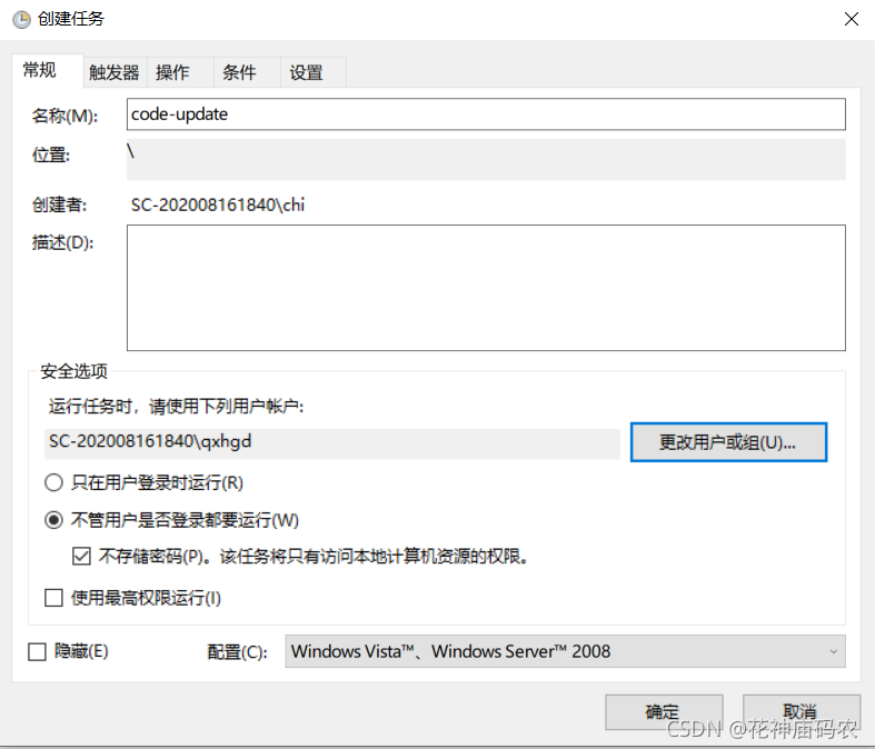 - 创建任务中,常规选项卡中,建议勾选不管用户登陆和不存储密码选项: