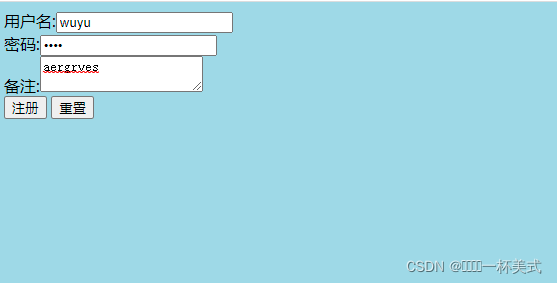 <%@ page language="java" contentType="text/html; charset=UTF-8" pageEncoding="UTF-8"%> <!DOCTYPE html> <html> <head> <meta charset="UTF-8"> <title>注册</title> <style> #a { width:50%; height:200px; border: 1px dashed ; background-color:lightyellow; text-align:center; } body{ background-color:lightblue; } </style> </head> <body> <form action="doregister.jsp" method="post"> 用户名:<input type="text" name="uname"><br> 密码:<input type="password" name="upwd"><br> 备注:<textarea rows="" cols="" name="uinfo"> </textarea><br> <input type="submit" value="注册"> <input type="reset" value="重置"> </form> </body> </html>