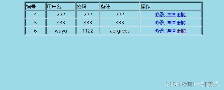 <%@page import="java.sql.ResultSet"%> <%@page import="java.sql.PreparedStatement"%> <%@page import="java.sql.DriverManager"%> <%@page import="java.sql.Connection"%> <%@page import="oracle.jdbc.driver.OracleDriver"%> <%@ page language="java" contentType="text/html; charset=UTF-8" pageEncoding="UTF-8"%> <!DOCTYPE html> <html> <head> <meta charset="UTF-8"> <title>主页面</title> <style> #a { width:50%; height:200px; border: 1px dashed ; background-color:lightyellow; text-align:center; } body{ background-color:lightblue; } </style> </head> <body> <table border="1" align="center" width="80%"> <tr> <td>编号</td> <td>用户名</td> <td>密码</td> <td>备注</td> <td>操作</td> </tr> <% //连接数据库 进行查询所有数据 //注册驱动类 Class.forName("oracle.jdbc.driver.OracleDriver"); //连接数据库 String url = "jdbc:oracle:thin:@localhost:1521:orcl"; Connection con = DriverManager.getConnection(url, "scott", "tiger"); //创建Pre对象 PreparedStatement ps = con.prepareStatement("select * from T277 order by uuid"); //执行sql语句 ResultSet rs = ps.executeQuery(); //处理结果-遍历结果集 while(rs.next()){ %> <tr align="center"> <td><%=rs.getInt(1) %></td> <td><%=rs.getString("uname") %></td> <td><%=rs.getString("upwd") %></td> <td><%=rs.getString(4) %></td> <td> <a href="doup.jsp?uuid=<%=rs.getInt(1)%>">修改</a> <a href="info.jsp?uuid=<%=rs.getInt(1)%>">详情</a> <a href="dodel.jsp?uuid=<%=rs.getInt(1)%>">删除</a> </td> </tr> <%} %> </table> </body> </html>