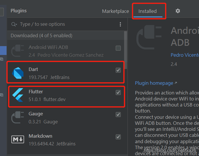 第一步打开Plugins,第二步,在Marketplace中安装Flutter和Dart。