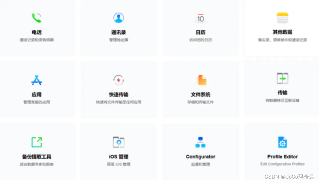iMazing是一款专业于iOS设备管理应用的软件,所以它在设备管理的功能上是远超于iTunes的,如图四是这款软件所包含丰富的功能。接下来,小编就介绍几个它独有的设备管理功能。
