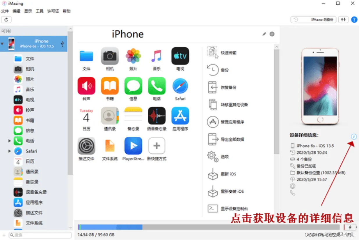 iMazing的界面分为上方菜单栏、左侧连接设备栏、中间的应用栏和功能栏,右侧的显示设备详细信息栏。而且整个界面图标较突出,可以帮助用户快速理解整个界面的功能。