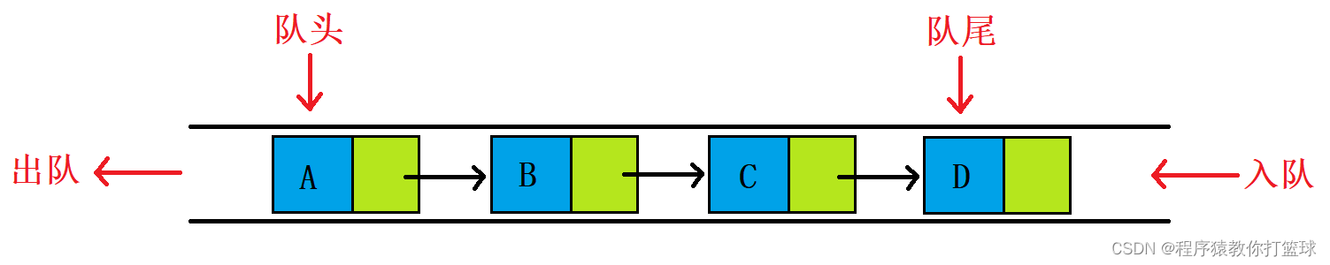 队列也可以数组和链表的结构实现,使用链表的结构实现更优一些,因为如果使用数组的结构, 出队列在数组头上出数据,效率会比较低。