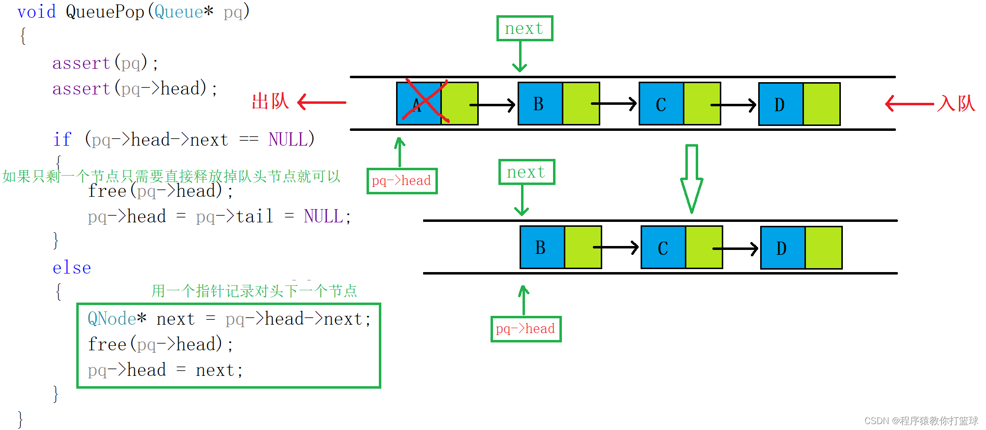 void QueueDestory(Queue* pq) { assert(pq); QNode* cur = pq->head; while (cur) { QNode* next = cur->next; free(cur); cur = next; } pq->head = pq->tail = NULL; }
