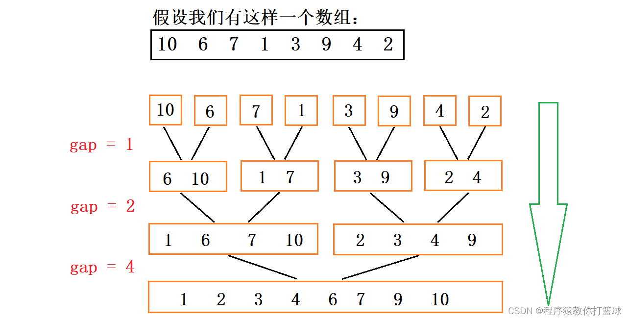 上期我们知道归并需要开辟一个数组,并且使用分治的算法来实现归并排序,而非递归版本我们的思路也是差不多,先让他们一个一个归并,然后两个两个归并,再接着四个四个一起归并,具体图解见下: